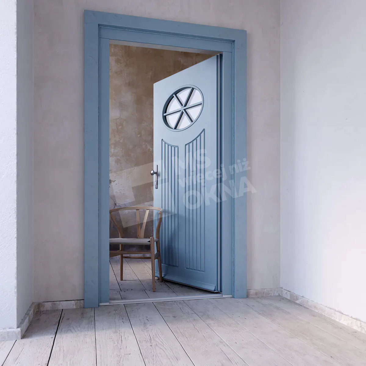 Porte d’entrée en bois ouvrant vers l’intérieur